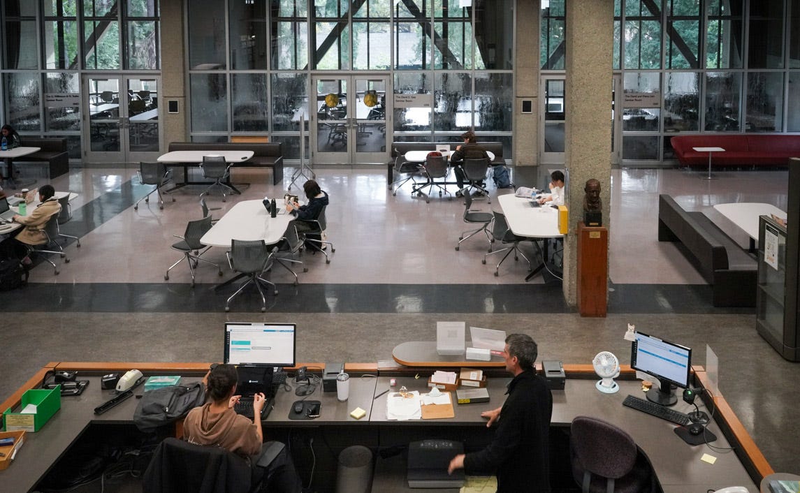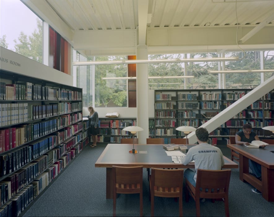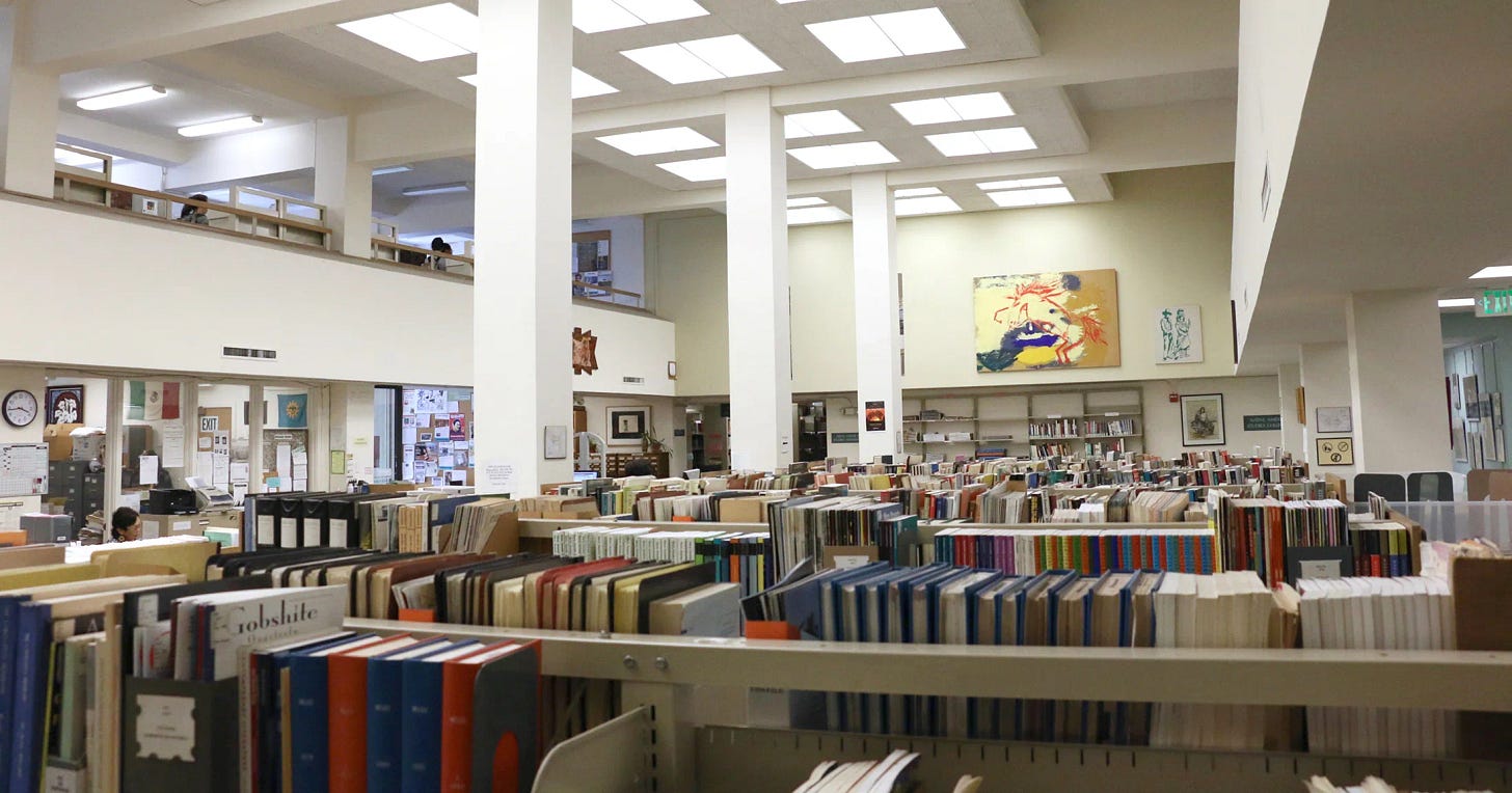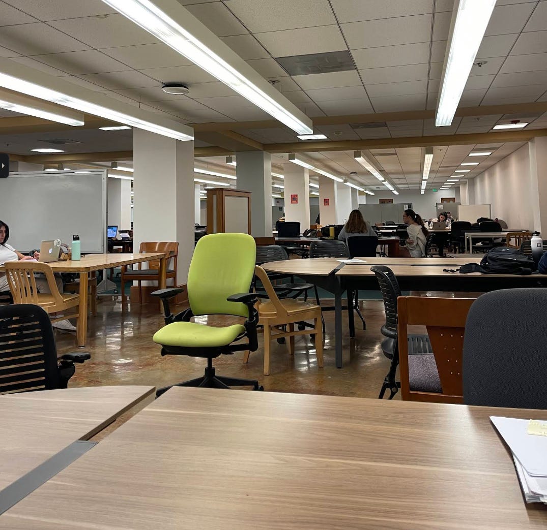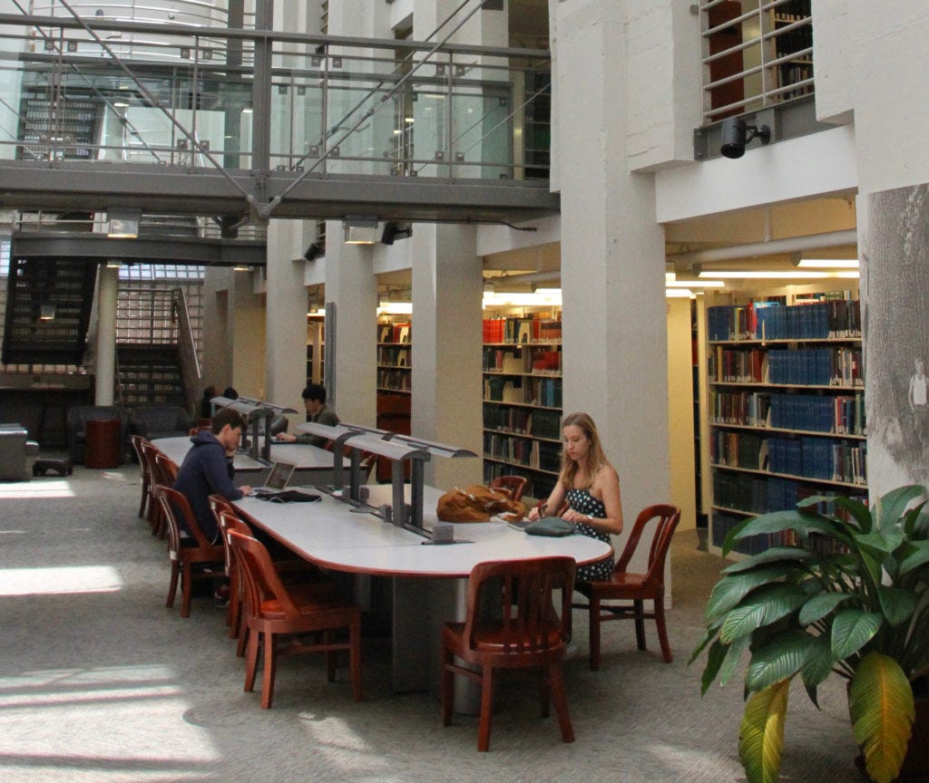 I LOVE this library, but there’s one thing holding it back from being higher up on this list (and it’s not that my roommate Lucas works there)6. It’s super cozy, has great vibes, and is a fantastic spot - if you’re following the rules. There’s a ‘no keyboard’ rule in effect here, to prevent noise from laptops. It does help curate the atmosphere, aided by comfortable couches and armchairs reminiscent of the Gryffindor common room, but makes studying difficult. It’s a great place to relax or do some light work, however. Don’t try and push the quiet rule - the staff will boot you out right away. Morrison also gets an extra shout-out for their art loaning program7.