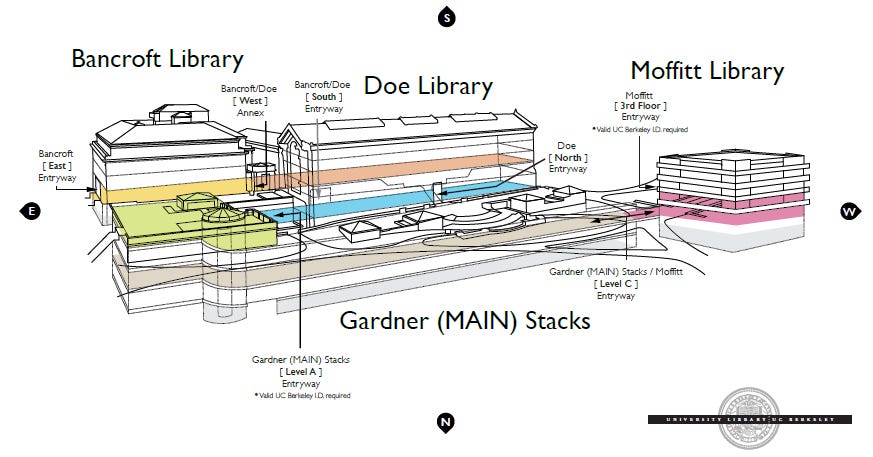 I assumed that Berkeley would have good photos of their libraries on the internet, so I didn’t take any of my own while surveying, but that wasn’t really the case. I apologize for some of the photos here, they’re the best I could find.